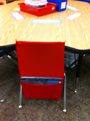 Finally, one of my teammates came up with an AWESOME and VERY inexpensive way to create chair pockets for workbooks that won't fit in the basket, and it makes a great place for my kiddos to keep their library book - Kinders aren't allowed to take librarybooks home - Check out the pictures of these GREAT chair pockets!